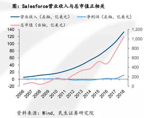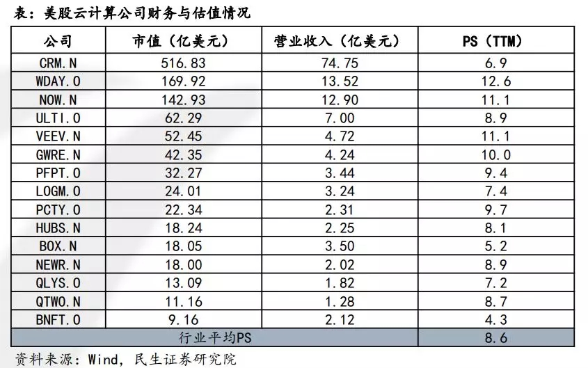 以美国云计算巨头Salesforce为例,公司2006-2018年间收入快速增长,但盈利能力并不稳定,公司市值与营业收入呈现较为明显的正相关性。从估值水平来看,公司PE波动较大缺乏参考价值,而PS则基本处于6-9x的区间。由此可见,对于云计算公司,PS是更为适宜的估值方式。