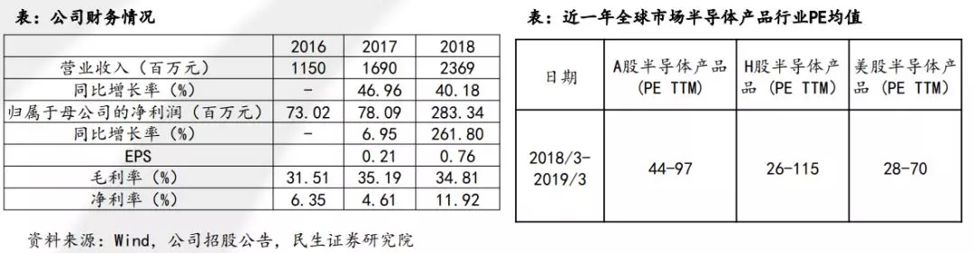 从公司2016-2018年的财务数据看,公司净利率直线上升,营收增速较快,现金流表现较好。从市场情况看,公司市占率高,行业位置已确定,运营相对成熟,因此从企业生命周期看,也是可以参考同类公司PE情况,利用PE进行估值。考虑从近一年的全球半导体产品估值看,A股估值相对较高,外加考虑晶晨股份市占率居行业第一,采用A股行业均值偏上空间,因此预计PE在55-70间,市值预计155-200亿间。