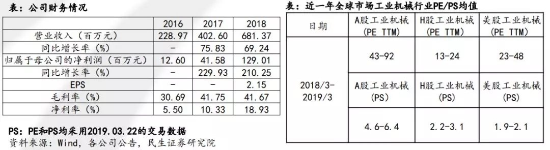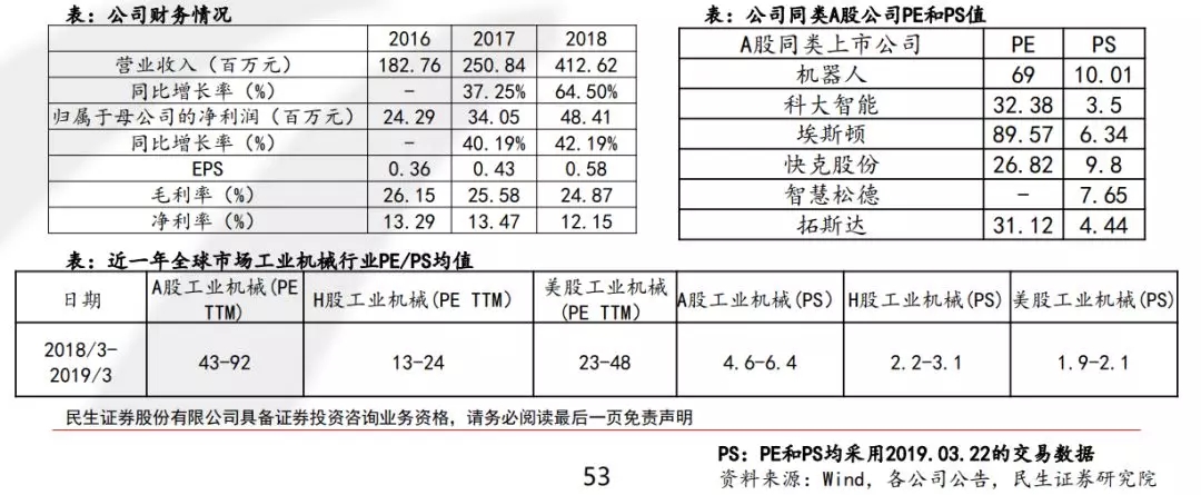 目前,虽然公司工业机器人集成业务技术与模式已较为成熟,其中在汽车制造流程中的焊接部分自动化产品渗透率已经非常高,但未来在工业机械方面,存在技术延伸的可能。目前虽然运营模式与A股同类公司存在近似,但是A股同类公司的PE波动相对较大,而PS区间则相对明确多在5-10间。此外,对比全球市场工业机械PE和PS估值,A股估值相对较高,因此采用A股同类PS估值相对符合国内科创板行情。因此建议采用参考国内A股公司PS估值,PS 5-10X,市值约在20-41亿间。