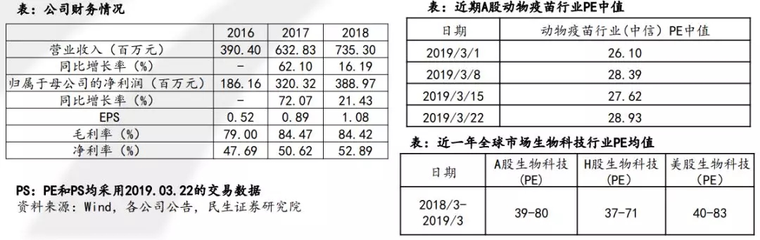 从公司财务数据看,营收和净利润增速出现下降,但是公司的毛利率,净利率相对较高,财务质量相对较好。外加公司在手专利与上市产品的口碑均在行业领先地位,动物疫苗行业发展也相对成熟,我们认为可采用PE估值法,目前动物疫苗行业中值PE在26-30之间,考虑科创板的市场情绪及全球市场生物科技行业PE均值,我们预计公司PE在30—50X间,预计公司市值在117-195亿间。