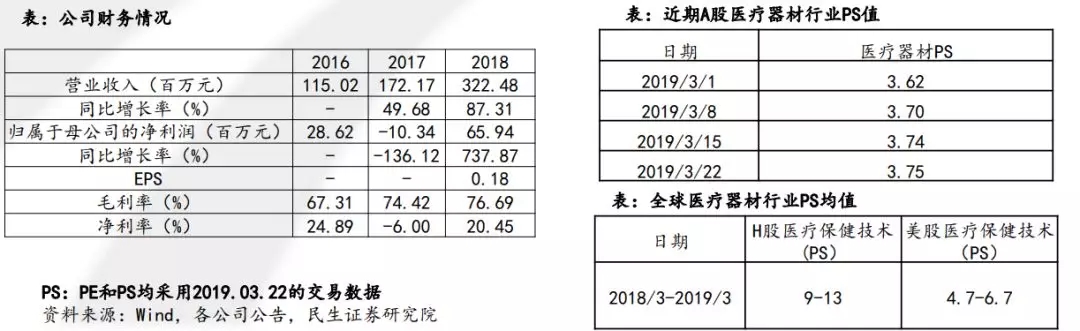 从公司财务数据看,公司研发投入相对较大,导致前2年净利润为负,此外公司的营收增速相对较快,毛利率相对较高,产品的实用型较强,专利技术领先,建议采用PS估值,目前A股医疗器材行业PS为3.6-3.8X,美股医疗保健技术PS均值为4.7-6.9X,港股PS均值为9-13X,考虑公司技术领先,科创板市场情绪,PS估值在10-20X间,估值在32-64亿。