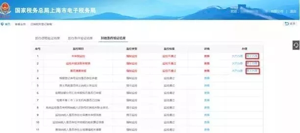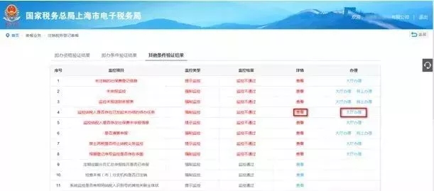 2.查看具体校验未通过的指标,对于可在网上办理的事项,则在监控项目最后办理列显示“网上办理”,点击即可跳转办理。