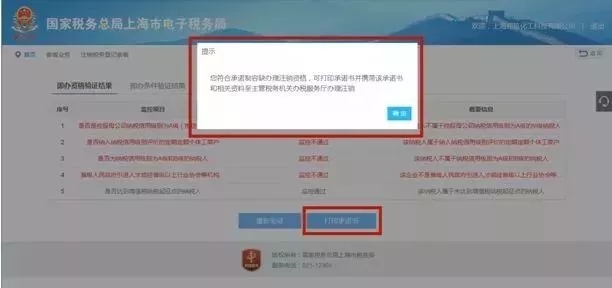 3.指标校验后,对于符合税总发〔2018〕149号文承诺制容缺办理注销的纳税人,可在注销套餐中下载打印注销承诺书(请法人代表或者法人代表协同财务负责人,请当天携带承诺书和相应注销登记所需材料至主管税务机关办税服务大厅办理;隔天承诺书自动作废,需重新在电子税务局注销套餐业务中打印承诺书)