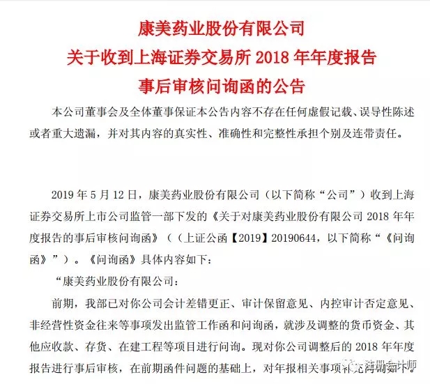 而就在今天,康美药业又收到上交所2018年年度报告事后审核问询函的公告。