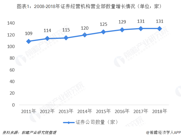 2018年,我国证券行业共有131家证券公司,资产总额为6.26万亿元。在中国证券公司营业部可谓是个庞大的群体。2008年以前,全国证券营业部数量扩张比较缓慢,直至2008年5月,中国证监会放宽券商新设营业部的资格条件,鼓励券商发展营业网点。由于证券营业部的建设需要短暂的周期,因此这一决定的实施,促使券商营业部数量在此后两年大幅度增加。