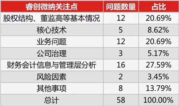 2. 财务数据问题管理层最关注,核心技术层面监管层会问询的很细致。问询问题集中在:股权结构、董监高等基本情况;核心技术;业务问题;公司治理;财务会计信息与管理层分析;风险因素等6大类问题。其中财务会计信息与管理层分析方面的问题最多。