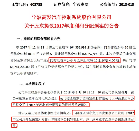 各位同学需要注意一下,2018年11月23日,沪深交易所分别发布高送转信息披露指引,就上市公司高比例送转股份行为做出进一步规范——即如果分配方案涉及高送转的,需与董事会决议同时公告(还有一堆乱七八糟的其他要求),本文中所举的案例仅是举例,如本文案例或你所见到的之前的案例,如与新披露指引有冲突的,以新指引为准,案例仅供参考。