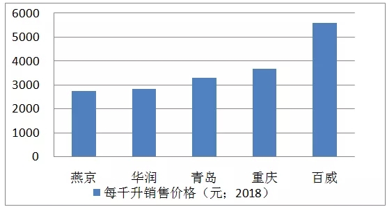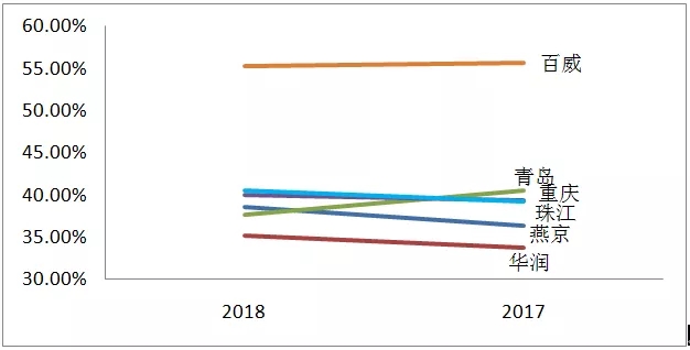 通过简单除法计算可得,2017、2018年百威亚太每千升啤酒销售价格为763.8美元、811.3美元,折合人民币分别为5252.65元、5579.3元,很明显高于国产啤酒,甚至是燕京、华润的两倍。百威极强的品牌溢价带来利润的提升,使得它的毛利率大幅超过中国啤酒上市公司整体毛利率。