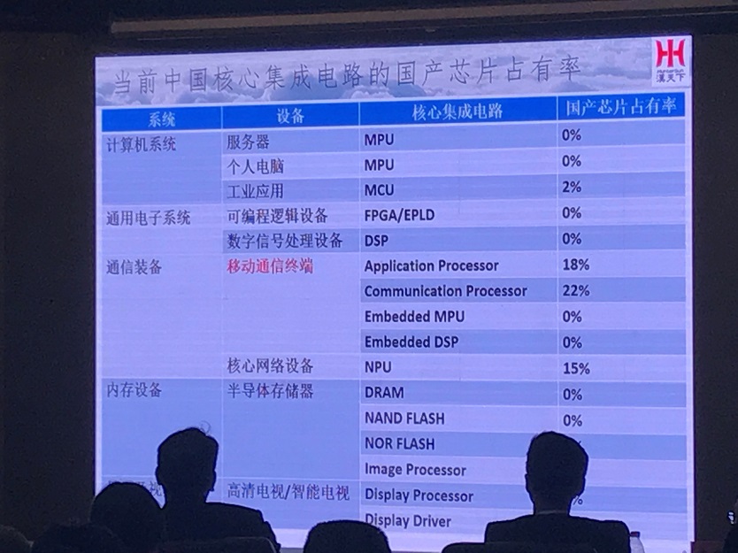 满屏的0%下图是杨清华展示的中国核心集成电路的国产芯片占有率情况。可以清晰的看到,除了工业应用MCU的2%、移动通信终端的应用处理器和通信处理器的18%和22%、核心网络设备NPU的15%、半导体存储器NOR Flash和图像处理领域的5%、以及高清电视显示处理器的5%外,满屏的0%。