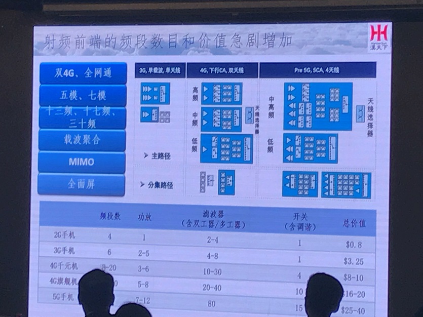 射频前端成为“兵家必争之地”过去的十年间,通信行业经历了从2G(GSM/CDMA/Edge)到3G(WCDMA/CDMA2000/TD-SCDMA),再到4G(FDD-LTE/TD-LTE)的两次重大产业升级,双4G/全网通、五模/七模、十三频/十七频/三十频、载波聚合、MIMO、全面屏逐渐成为智能手机标配,导致包括射频开关、射频低噪声放大器、射频功率放大器、双工器、射频滤波器在内的射频前端器件数量和价值急剧增加。例如,2G时代,手机频段数是4,总价值是$0.8;3G时代,手机频段数上升到6,总价值$3.25;然而到了4G时代,千元机频段数就达到了8-20,总价值$8-10;旗舰机频段数在17-30,需要20-40个滤波器,10个开关,总价值$16-20;而到了5G 手机,频段数将达到50,需要80个滤波器和15个开关,总价值达$25-40。