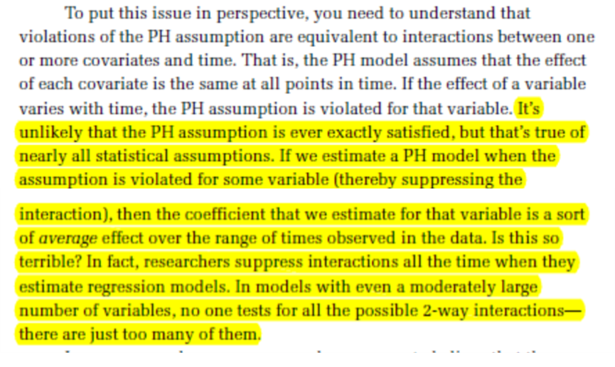 1.生存分析中,二分类变量的supremum检验结果不符合等比例风险假设,但KM曲线无交点,在对结果进行描述的时候就无法以时间交点进行分段讨论,这种情况下是否可以不用再考虑研究变量与时间的交互作用,而只计算如下教材中高亮的