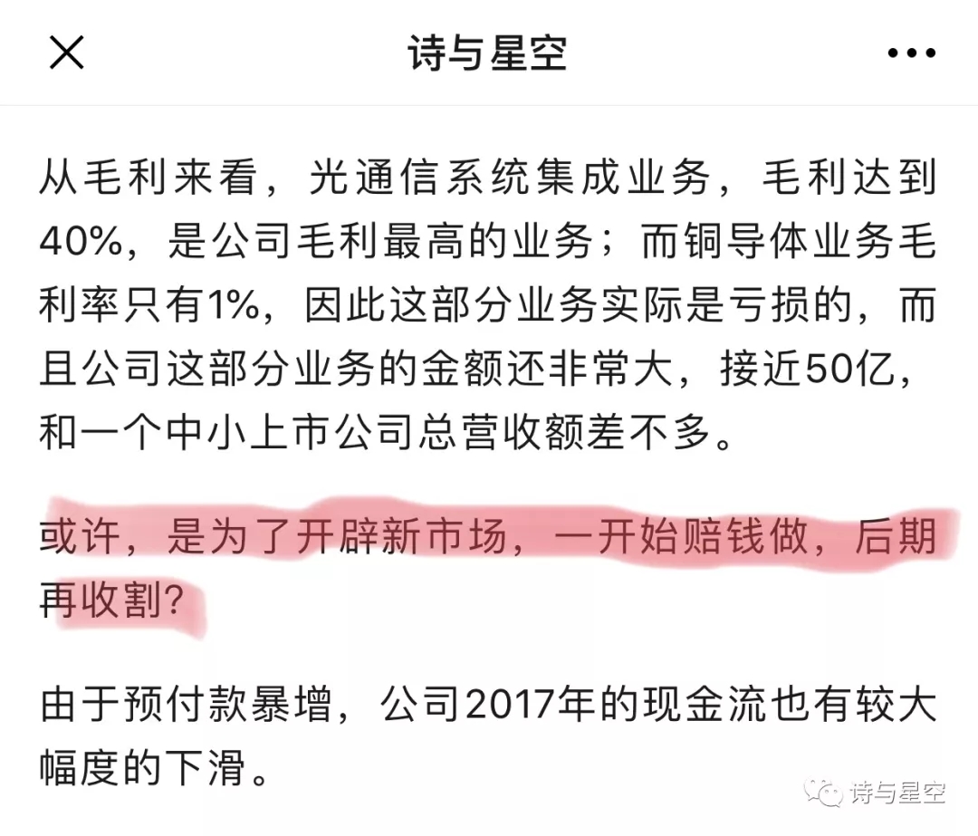 先说第二点,表哥曾经在2018年6月29日的《要有光,于是有了亨通光电》分析年报的时候作为疑问提出,并提出了自己的见解:或许是为了开辟新市场,一开始赔钱做,后期再收割?