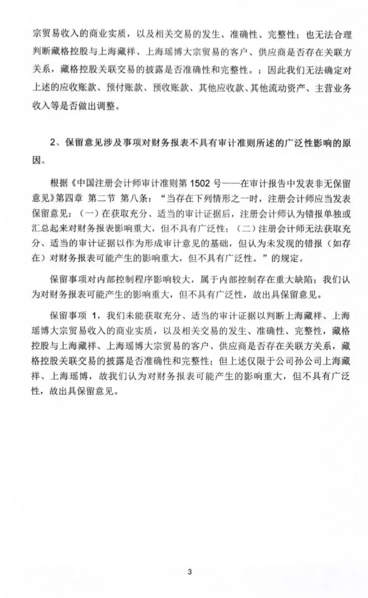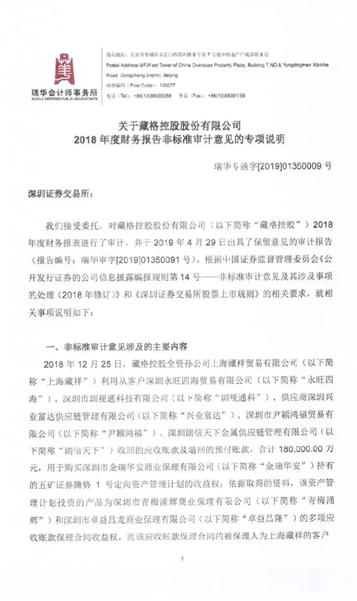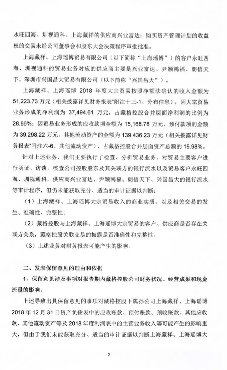 6. 近两年你公司贸易业务增长迅速且对净利润的贡献较大。报告期内,上海藏祥、上海瑶博 2018 年度大宗贸易按照净额法确认的收入金额为 5.12 亿元,因大宗贸易业务形成的净利润为 3.75 亿元,占你公司合并层面净利润的比例为 28.86%,净利润率约 73.24%,远高于同行业供应链业务上市公司(如浙商中拓钢铁及冶金原料贸易毛利率约 2.18%,物产中大供应链集成业务毛利率约 1.96%)。而 2016年,你公司尚未取得贸易收入。根据你公司临时公告,上海藏祥设立于 2017 年 6 月,上海瑶博设立于 2017 年7 月,注册资本均为 3000万元,均由控股子公司藏格钾肥设立。请你公司对下列问题进行说明: (1)除上海藏祥、上海瑶博外,你公司是否存在其他开展贸易 业务的主体,如是,简要说明相关主体的基本情况及开展贸易业务的 内容。 (2)2018 年 7 月 12 日,你公司之孙公司北京鲲泽贸易有限公司向工商管理机构办理注销。说明该孙公司的设立时间、股权结构、注册资本、最近两年又一期主要财务数据、收入及利润来源,报告期内办理注销的原因,注销后资产负债、人员业务等相关安排。 (3)结合行业发展情况和公司经营策略,说明你公司投资设立全资子公司开展贸易业务的原因、必要性及合理性,贸易业务与钾肥业务是否存在协同效应。 (4)说明 2017 年和 2018 年贸易业务前五大客户、供应商的具体情况及业务往来情况,包括但不限于客户及供应商名称,商品购销数量、金额及具体内容,资金往来情况(包括应收预付款等),是否具备业务连续性,该等客户、供应商之间是否存在关联关系或业务往来关系,以及其与你公司控股股东、实际控制人及其关联人在产权、业务、资产、债权债务、人员等方面是否存在关联关系或其他利益倾斜关系。 (5)请简要说明你公司与贸易业务前五大客户、供应商有关商品购销协议主要内容,采购垫款、销售回款安排,结合资金周转情况,详细说明你公司是否具备开展该等大宗商品贸易的资金实力,采购垫款及销售回款安排是否符合商业惯例。 (6)年审会计师表示未能获取充分、适当的审计证据以判断上海藏祥、上海瑶博大宗贸易收入的商业实质。请你公司说明该等贸易业务是否具备的商业实质,是否具有真实性,如是,请提供切实证据,如否,请说明虚假收入和利润的金额及对你公司财务报表的影响。 (7)列表披露2017年和2018年贸易业务各类产品的采购金额、销售金额、毛利润和净利润,说明经营模式(买断销售或委托代销等)、运营模式(如自产自销或者批发销售等等)。结合经营模式、资产周转能力、利润构成等因素说明你公司贸易业务的盈利驱动因素,与贸易类上市公司进行比较,结合资产运营能力、供应链整合能力等因素,说明你公司贸易业务利润率与同行业上市公司相比差异巨大的原因及合理性。 (8)请年审会计师详细说明对你公司贸易业务的真实性、公允性执行的审计程序,对贸易业务主要客户及供应商的函证情况(包括但不限于发函对象、发函覆盖率、回函收回及回函差异情况)、应收账款期后回款情况、预付账款期后退还情况,并对贸易业务真实性及公允性、采购垫款及销售回款过程是否存在异常发表核查意见。 藏格控股股份有限公司(以下简称“公司”)聘请瑞华会计师事务所(特殊普通合伙)(以下简称“瑞华所”)为本公司 2018 年度内部控制审计机构,瑞华所 2018 年度内部控制出具了否定意见的审计报告。 一 、导致否定意见的事项原文如下: 重大缺陷,是指一个或多个控制缺陷的组合,可能导致企业严重偏离控制目标。 在此次审计中,我们识别出藏格控股的财务报告内部控制存在以下重大缺陷: 2018 年 12 月藏格控股未经过董事会审批,亦未按照公司章程、合同管理制度、控股子公司管理制度、重大信息内部报告制度等要求履行内部审批的情况下,下属全资子公司上海藏祥贸易有限公司支付给深圳市金瑞华安商业保理有限公司 180,000.00 万元资产计划收益权转让款;该资产计划收益权系五矿证券腾势 1 号定向资产管理计划,其下游产品系应收账款保理业务,藏格控股将该转让款作为其他流动资产进行核算。藏格控股未能及时识别该项交易是否存在关联方资金占用,未能核实财务报告中关联方及关联方交易是否完整性和信息披露的是否准确性;导致藏格控股在财务报告内部控制方面存在重大缺陷,导致与之相关的财务报告内部控制执行失效。 2、藏格控股对部分客户未按时履行货款支付义务的情况下,未及时履行货款催收义务,未及时与客户进行对账,未能按照《防止控股股东及关联方资金占用制度》及时识别该项交易是否存在关联方资金占用,导致公司控股股东及关联方占用公司货款,涉及金额 15,336.26 万元,使得公司制定的《防止控股股东及关联方资金占用制度》中防范资金占用措施失效。 藏格控股股份有限公司(以下简称“公司”或“藏格控股”)聘请瑞华会计师事务所(特殊普通合伙)(以下简称“瑞华”)为本公司 2018 年度财务报告审计机构,瑞华为公司 2018 年度财务报告出具了保留意见的审计报告。 国信证券股份有限公司 关于藏格控股股份有限公司 重大资产出售及发行股份购买资产并募集配套资金暨关联交易之2018 年度业绩承诺实现情况的核查意见及致歉声明 国信证券股份有限公司(以下简称“国信证券”或“独立财务顾问”)作为藏格控股股