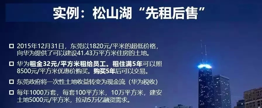 我用一个真实的例子,解释下一下什么是“先租后售”。2015年12月,东莞政府用成本价把土地卖给华为,条件是华为把工厂搬过来。
