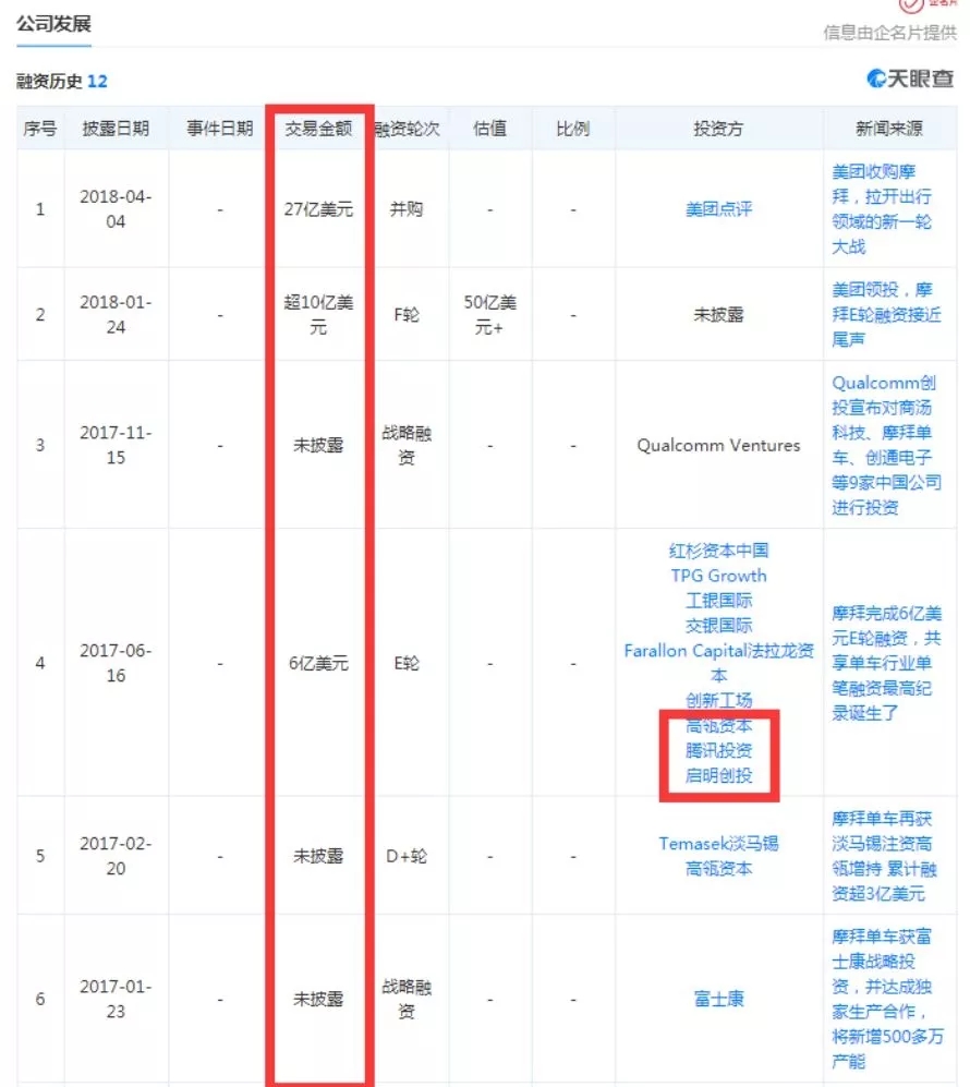 摩拜单车一度成为明星公司,红极一时。资料显示,摩拜前后共进行了12轮融资,高瓴、腾讯、红杉资本等知名企业,郭台铭、马化腾、李开复等大佬纷纷给予投资,融资金额近200亿。