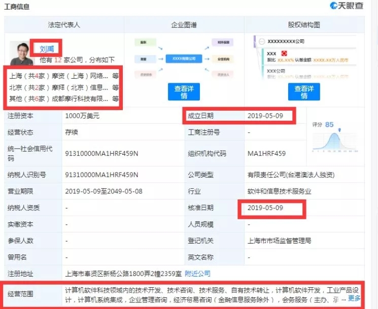 5月13日,据天眼查数据显示:上海考瑞科技发展有限公司于2019年5月9日成立,法定代表人为原摩拜单车CEO刘禹,摩拜创始人胡玮炜任监事。