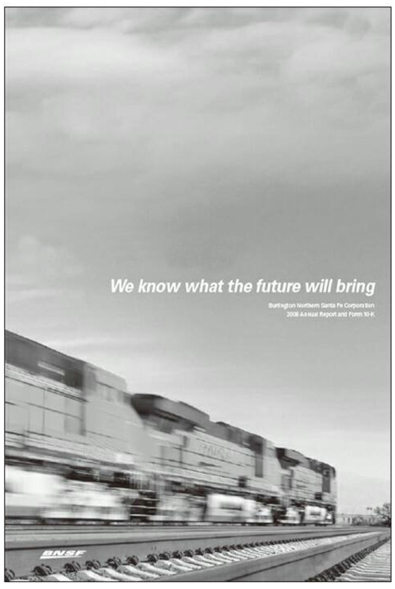 在2007年年底致股东的信函里,沃伦·巴菲特披露了北伯灵顿铁路公司(Burlington NorthernSanta Fe,BNSF)的股权交易:60828818份股票,总价47.3亿美元。这些数字代表了该公司17.5%的股权,均价每股77.76美元。这标志着巴菲特对北伯灵顿铁路公司的初始投资——后者曾是且仍然是北美两大铁路公司之一(另一家是联合太平洋铁路公司)。2009年年底,在另一次交易中,巴菲特和伯克希尔–哈撒韦购买了该公司所剩余的所有流通股。此时该公司的总市值为340亿美元,相当于每股100美元的3.412亿流通股。这次所购股份占了该公司总股份的77.4%。2007~2010年,伯克希尔–哈撒韦公司把所持的该公司股份从17.5%增加到22.6%。本章将从2007年的初始投资角度和2010年全额收购的角度,看看巴菲特对北伯灵顿公司投资的相关情况。经营一个铁路网往往需要很多的资金。北伯灵顿公司的绝大部分收入来自北美各主要经济中心之间的货物运输,因此产生了维护下述项目的成本费用:大量机车和车厢、轨道基础设施和整套的支持设施,包括场地、站台、调度中心以及特殊服务和维修站点等。根据北伯灵顿公司2008年年报(见图19-1),该公司有接近40000名雇员、6510台机车、82555节车厢。该公司的首席执行官和董事长马修·罗斯披露:1997~2008年,北伯灵顿公司支出了300亿美元改善其轨道设施和全部车辆。以任何尺度衡量,这种投入都是一笔巨资。除了处理日常的经营外,运营一家盈利的铁路公司还涉及在企业的扩张过程中,理智地配置资金、维系相应的竞争格局、成功地把握诸如轨道铺设权等监管问题。
