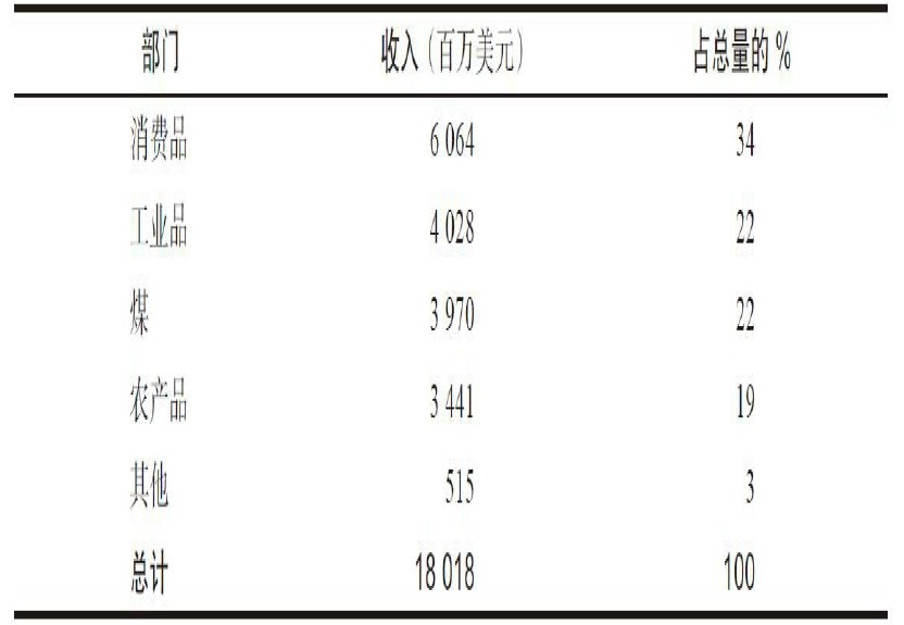 在2008年,不计其他类别,4个核心货运部门创造了175亿美元的收入。如表19-1所示,虽然从事消费品运输的部门是最大的部门,但工业品、煤和农产品的量也不小。