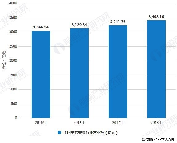 3、经营情况来看,据前瞻产业研究院发布的《中国美容美发行业市场前瞻与投资规划分析报告》统计数据显示,2016年全国美容美发行业营业额达到3129.24亿元,同比增长2.7%。截止至2017年全国美容美发行业营业额增速回升至3.59%,营业额达到3241.75亿元。初步测算2018年,全国美容美发行业营业额预计在3408.16亿元左右。