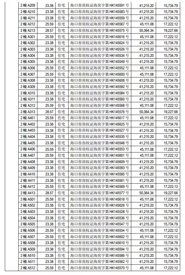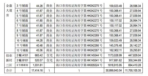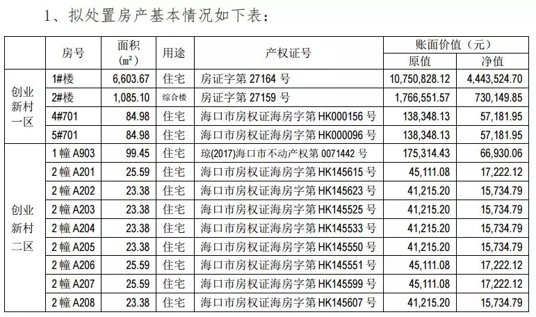 其中,住宅269套(总面积14,685.04平方米),商铺15套(总面积2,729.12平方米)。账面价值原值为30,899,943元,最终处置价格以成交价为准。