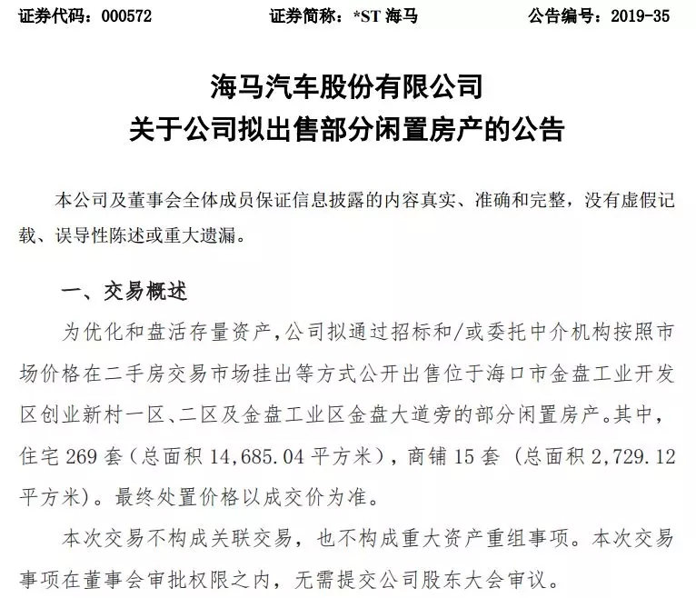 就在不久前的4月22日晚间,海马汽车发公告说,拟通过中介机构按照市场价格在二手房交易市场挂出并公开出售位于上海市的36套闲置房产(总面积4339.5平方米),以及位于海南省海口市的81套闲置房产(总面积6280.6平方米),账面原值为3386.17万元。