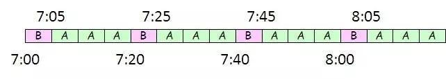 小明有两个女朋友,分别住在A和B,小明住在C。每个周日早晨,小明在C站等地铁,他决定听天由命,哪边的地铁线来了,他就登上地铁去看谁——两边地铁都是准时地每20分钟一趟车。