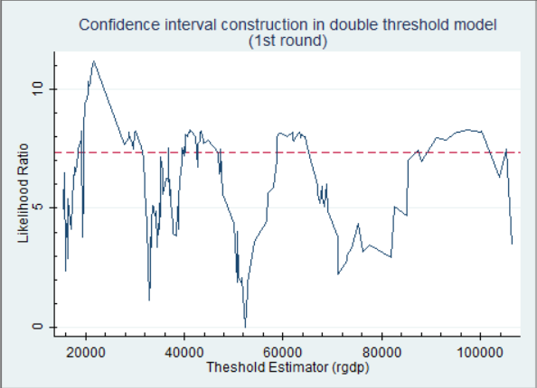 双重门槛模型估计时,画出的似然比图形有多个置信区间,这个怎么解释呀?
