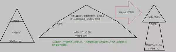 所以,高智商人数是1:1的两国,后国很难超越前国;甚至1:2或3也会很难,因为后国还有人才流失,前国不断吸纳;而如果后国总人口和前国总人口的比例,达到了一个临界值,即后国新生且保留下来的高智人口总是多于前国本土+吸纳来的高智人口,那么形势就会胶着很长时间,一个不大的机遇比如科技革命,大家站在同一起跑线上,可能形势就会逆转。