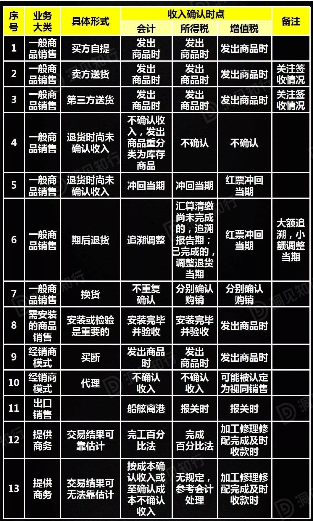 对比可见,所得税关于收入确认时点的规定在大部分情况下与会计处理保持一致,事实上《国家税务总局关于确认企业所得税收入若干问题的通知》 (国税函[2008]875 号)也明确了必须遵循权责发生制原则和实质重于形式原则,所列举的商品销售收入和提供劳务收入的确认条件与企业会计准则的规定完全一致。