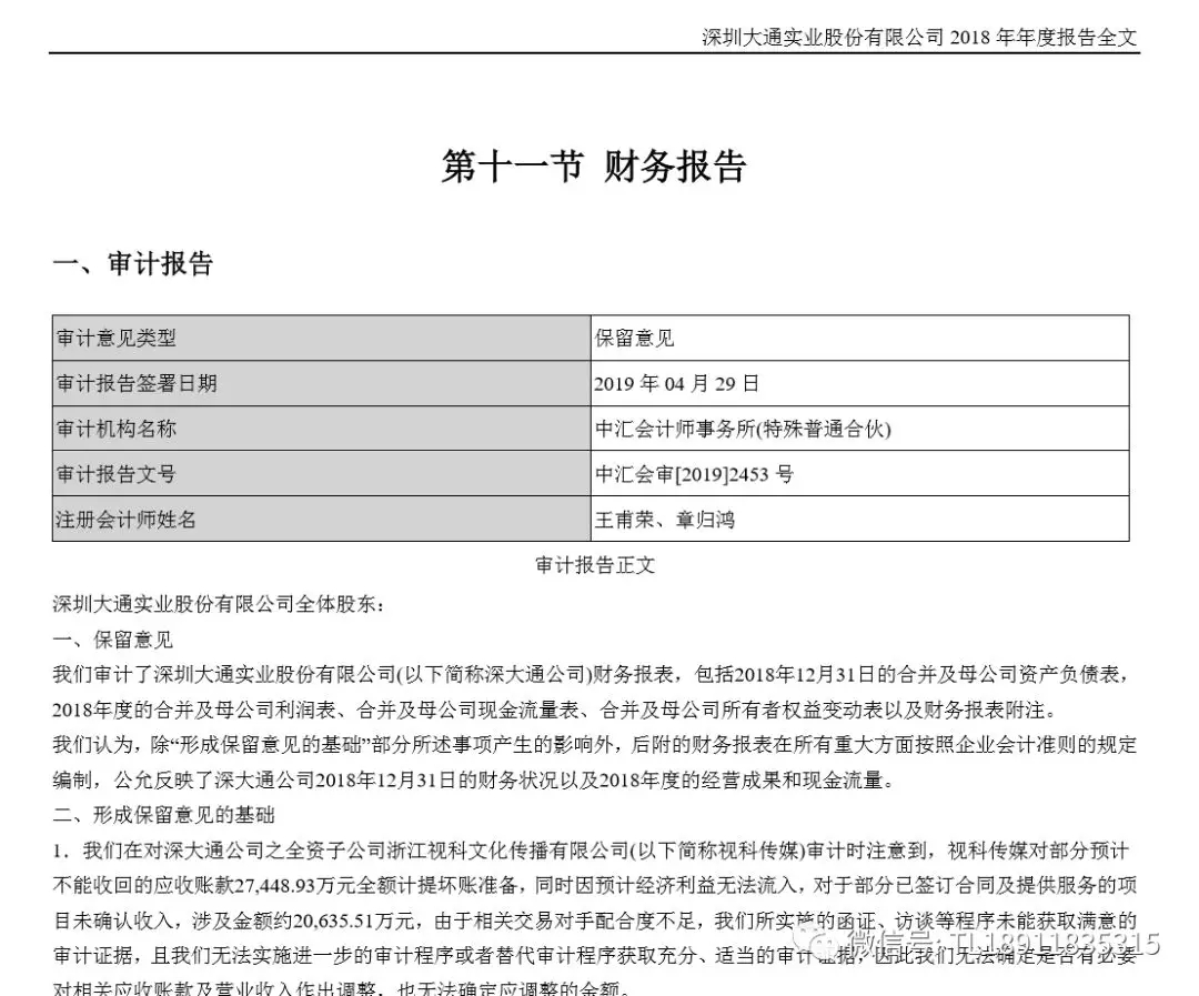 2.如财务报表附注五(十二)所述,深大通公司于2018年度对收购视科传媒、冉十科技(北京)有限公司(以下简称冉十科技)100% 股权时所形成的商誉分别计提减值准备133,998,84万元和78,287.66万元。我们对深大通公司提供的商誉减值测试相关资料执行了沟通讨论、分析、复核等必要的审计程序,但由于我们无法就冉十科技盈利预测数据及其假设的合理性获取充分适当的