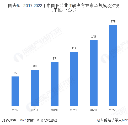 相比证券IT和银行IT,保险IT起步略晚,“十一五”末期整个保险行业的信息化工作才全面起步。但受益于国内保险行业的快速发展,保险公司在业务体量增加的同时加大了对信息科技的投入力度,保险IT市场发展迅猛。根据IDC数据,2017年我国保险业IT支出约为224亿元,解决方案市场规模约为65亿元;预计到2022年,保险业IT支出将达423亿元,解决方案市场规模约为178亿元。