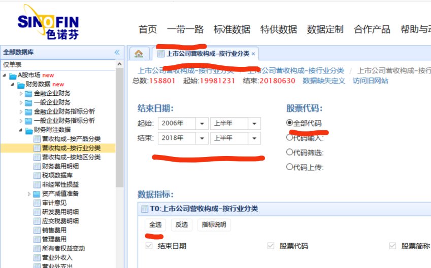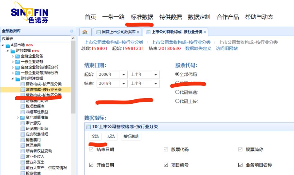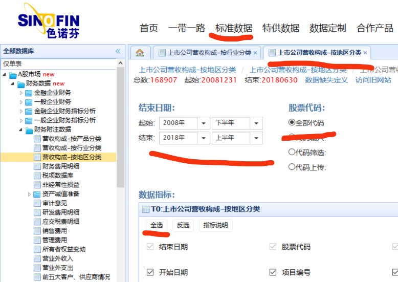 再在左侧栏选择“A股市场——财务数据——财务附注数据——营收构成按行业分类/营收构成按地区分类”