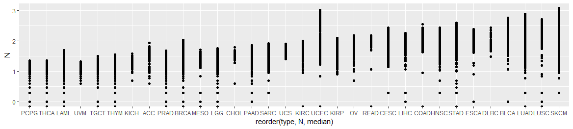 如下图,想知道这种横坐标是分类变量下,每个分类的点图还自带类似对数边换的排列,是怎么做到的?我目前代码做出来的只能是直线,目前猜想有可能是他做了facet,每个里头再进行排列和坐标轴边换,但是总觉得没有那么复杂。大家有什么idea吗?最好是ggplot2或者有成熟的包可以做。谢谢!!