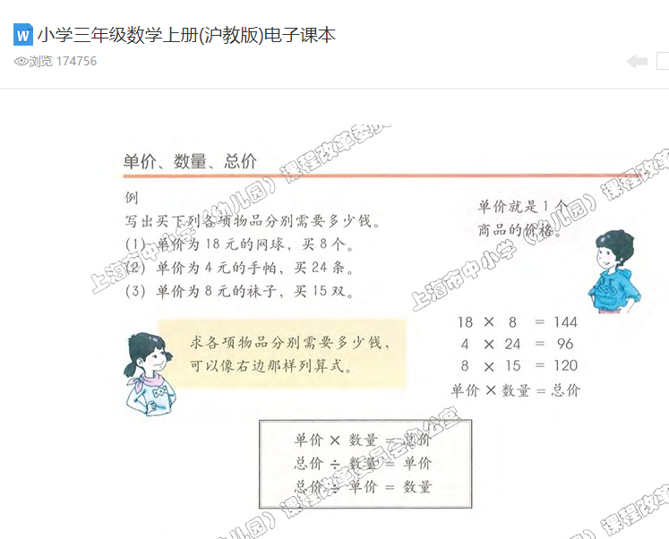举个例子: 3个篮球共240元,问:篮球的单价是多少? 单价 = 240元 / 3个 = 80 元/个 。