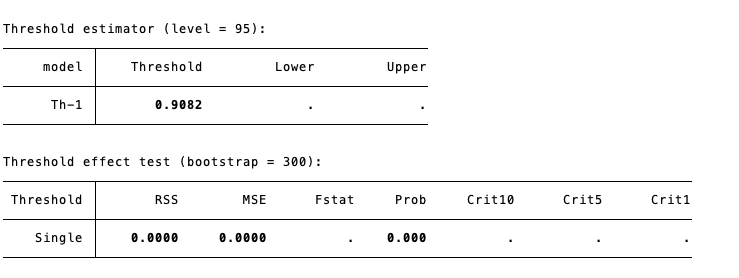 大无畏一 发表于 2021-4-26 20:46 Estimating the threshold parameters: 1st ...... thest(): 3200 conformabilit ...
