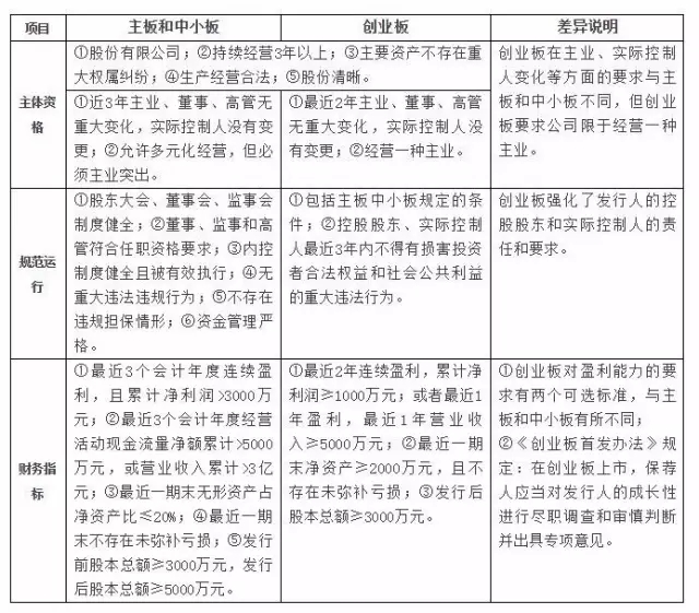 上表仅对企业在主板、中小板、创业板首次公开发行股票并上市应具备的主要条件进行了简要差异比较,具体条件可查阅中国证监会发布的《首次公开发行股票并上市管理办法》和《首次公开发行股票并在创业板上市管理办法》。