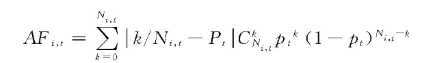 其中,p(i,t)=B(i,t)/(B(i,t)+S(i,t)),即表示在时期t内买入股票i的基金占买卖股票i的所有基金的比例,p(t)为时期t内预期买入股票i的基金占买卖股票i的所有基金的比例,调整因子AF(i,t)=E[|p(i,t)-p(t)|],它是在没有羊群行为存在的零假设条件下的|B(i,t)/(B(i,t)+S(i,t))-p(t)|的期望值。因为B(i,t)是服从参数为p(t)的二项分布,所以调整因子AF如下: