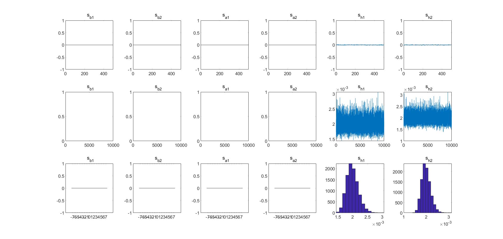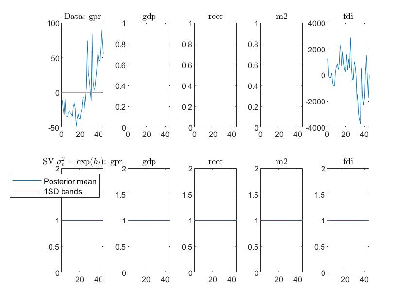 求问论坛的大神们,我毕业论文做5变量的TVP-VAR,用Nakajima的程序包,在跑tvp-var_ex1出来的sa1、sa2、sb1、sb2都是空值,然后出来的数据图里面中间三个也没有线。命令窗口提示“警告: 矩阵为奇异值、接近奇异值或缩放错误。结果可能不准确。RCOND = NaN。 ”