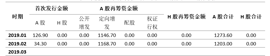 1.2019年3月中国股票市场筹资数据,包括A股、H股的首次发行金额;A股再筹资金额(含公开增发、定向增发、配股、权证行权);H股再筹资金额