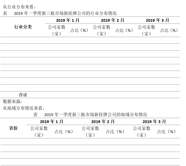 2019年一季度新三板市场新挂牌公司的行业分布情况,包括行业分类、公司家数及占比