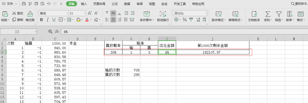 总资金初始值为1000,每次下注的本金为总资金的17%。(这个值可以在EXCEL里自行修改)