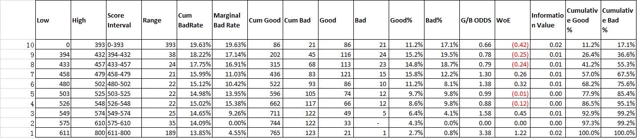 你可以看到在训练集中,我一共分成了5个风险等级的客户,至于为什么需要分成5个风险等级。其实是跟你的客户量跟你公司的人员架构有关,当然还有你公司的产品都是有密切关联的。如果你看一下我之前做过的贷前评分卡,你就会发现,我分成的客群大概是在10个等级左右。