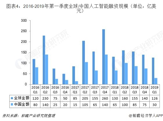 融资角度看,2018年Q2以来全球领域投资热度逐渐下降。2019Q1全球融资规模为126亿美元,环比下降3.08%;其中中国领域融资金额为30亿美元,同比下降55.8%。在全球融资总额中占比23.5%;比2018年同期下降了29个百分点。