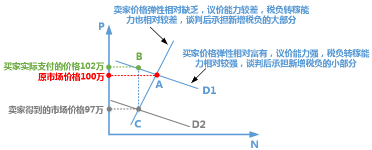 因为买家处于主导议价的地位,为转稼税负,可以要求卖家降低价格至95万销售;而卖家的供给价格弹性也并非“完全无弹性”,可以与买家还价。最后以97万元成交(下图中,需求由线由D1位置移至D2位置)。
