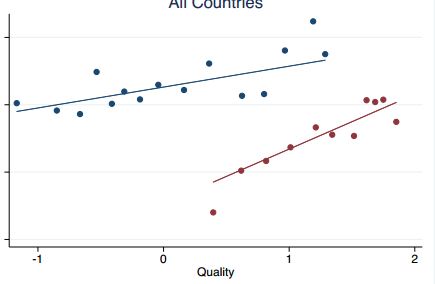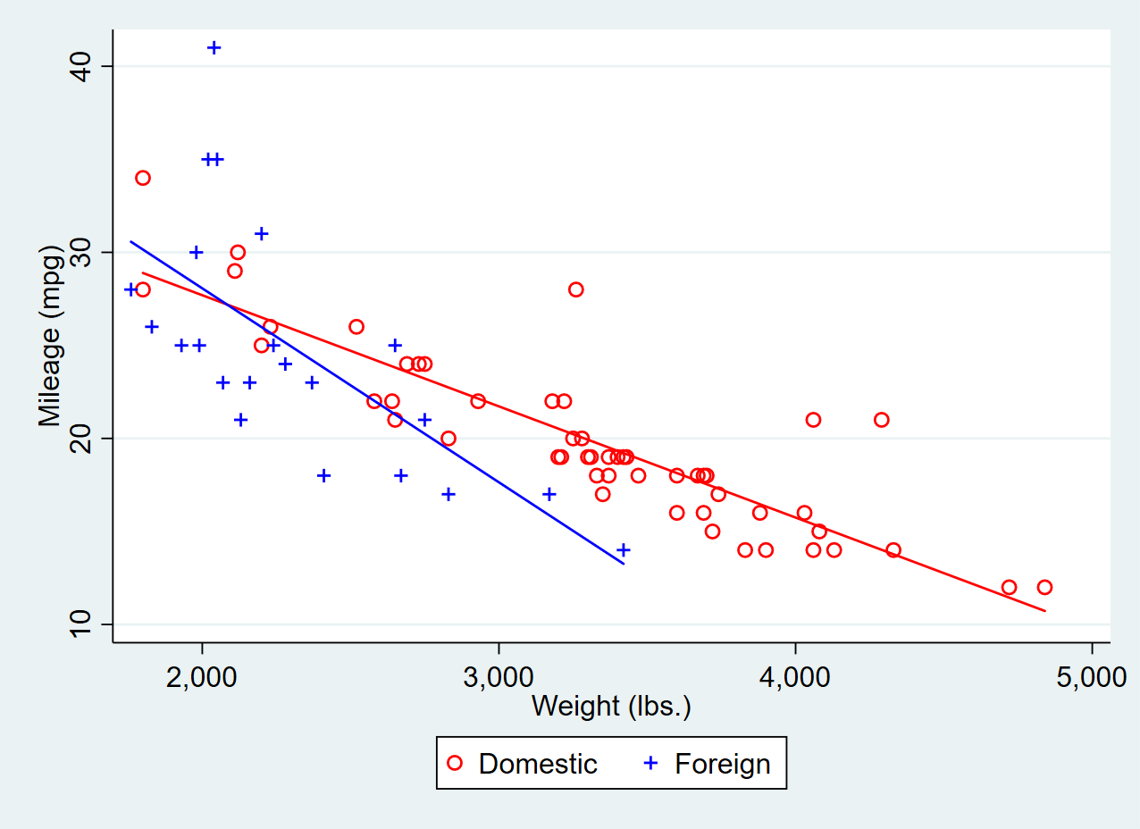 sepscatter y7 WGI, sep(income) mc(red blue pink yellow) addplot(lfit y7 WGI if !income, lc(red) || lfit y7 WGI if income, lc(blue) || lfit y7 WGI if !income, lc(pink) || lfit y7 WGI if income, lc(yellow)) legend(order(1 2))