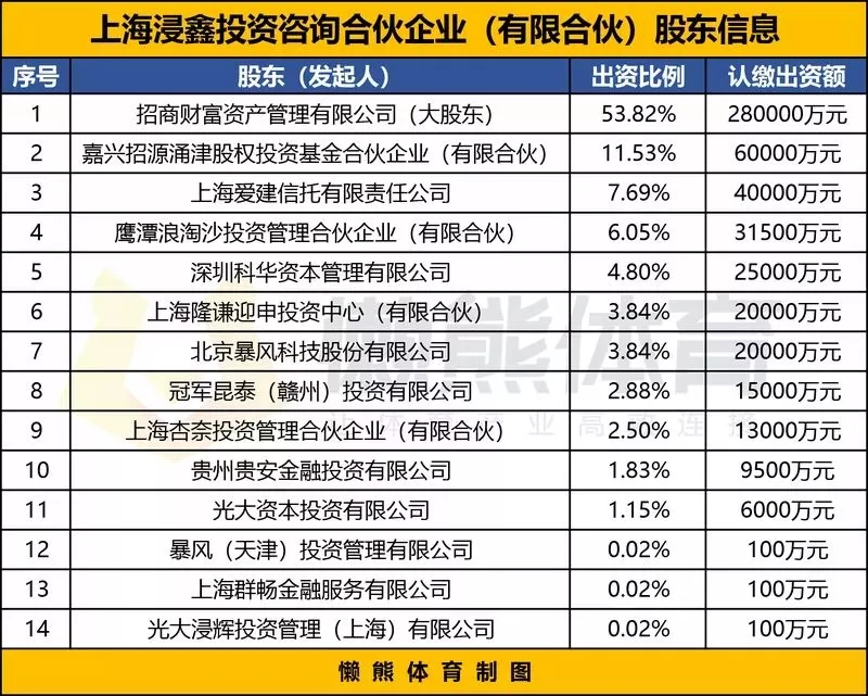 工商注册信息显示,浸鑫基金的股东名单中共包括了14位出资方,出资规模共计52.03亿元。其中,出资最多的为招商财富资产管理有限公司,其出资28亿元;其次为出资6亿元的嘉兴招源涌津股权投资基金合伙企业(有限合伙);