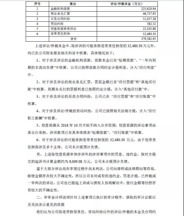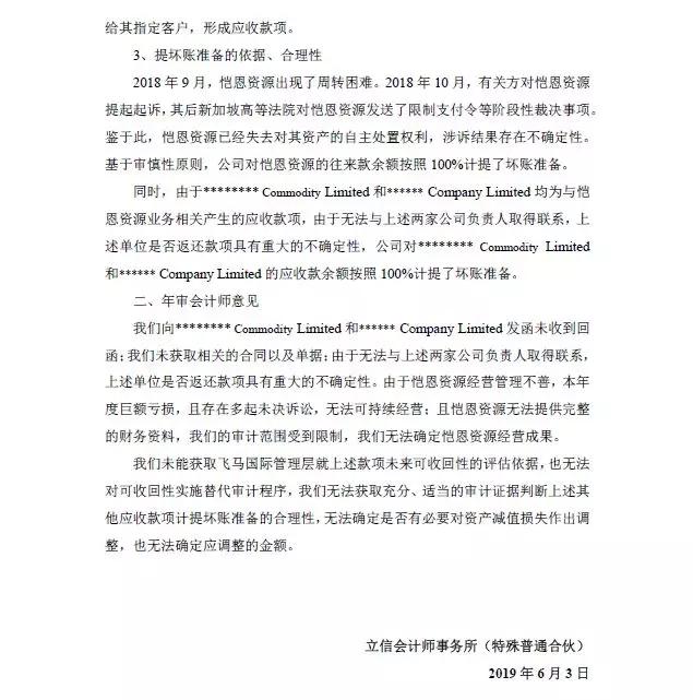 会计师意见:我们向******** Commodity Limited和****** CompanyLimited发函未收到回函;我们未获取相关的合同以及单据;由于无法与上述两家公司负责人取得联系,上述单位是否返还款项具有重大的不确定性。由于恺恩资源经营管理不善,本年度巨额亏损,且存在多起未决诉讼,无法可持续经营;且恺恩资源无法提供完整的财务资料,我们的审计范围受到限制,我们无法确定恺恩资源经营成果。