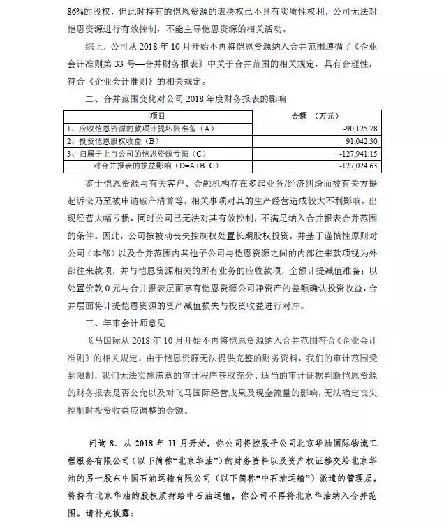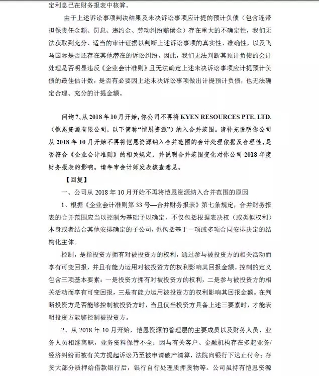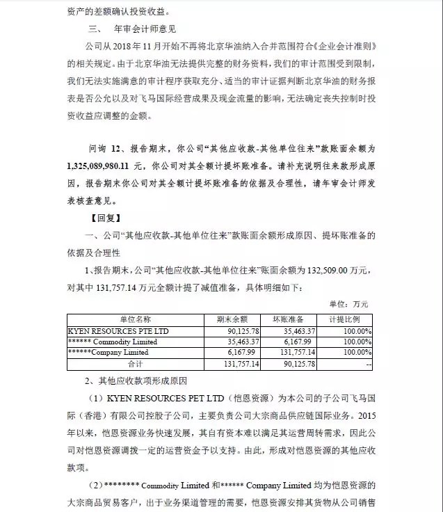 3、涉及子公司恺恩资源以及北京华油事项 子公司KyenResources Pte. Ltd(以下简称“恺恩资源”)由于诉讼以及经营困难无法持续经营,飞马国际对子公司北京华油国际物流工程服务有限公司(以下简称“北京华油”)实质上失去了控制,从2018年10月开始,飞马国际开始不再将恺恩资深圳市飞马国际供应链股份有限公司 2018 年年度报告全文 80 源、北京华油纳入合并范围。由于恺恩资源、北京华油无法提供完整的财务资料,我们的审计范围受到限制,我们无法实施满意的审计程序获取充分、适当的审计证据判断恺恩资源、北京华油的财务报表是否公允以及对飞马国际经营成果及现金流量的影响,无法确定丧失控制时投资收益应调整的金额。