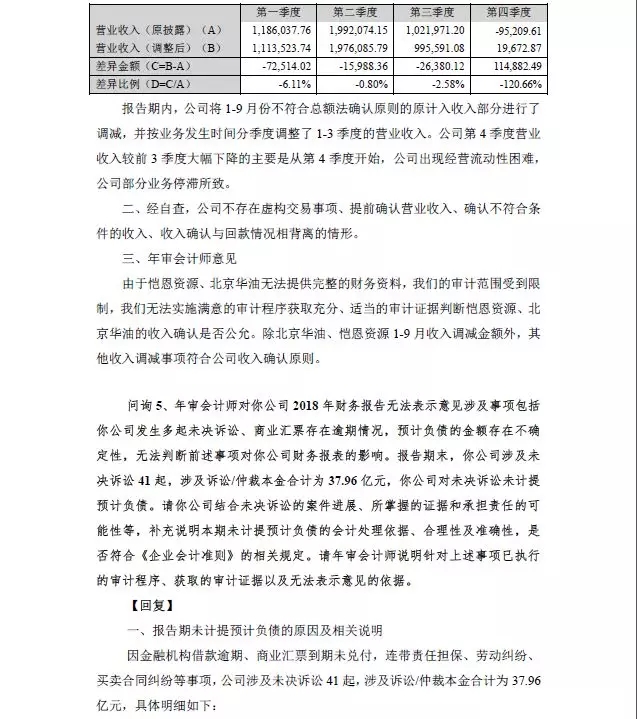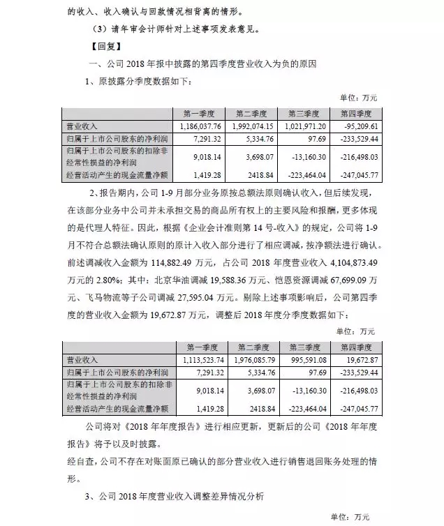 问询3、年报披露,你公司2018年第四季度营业收入为-952,096,130.00元。