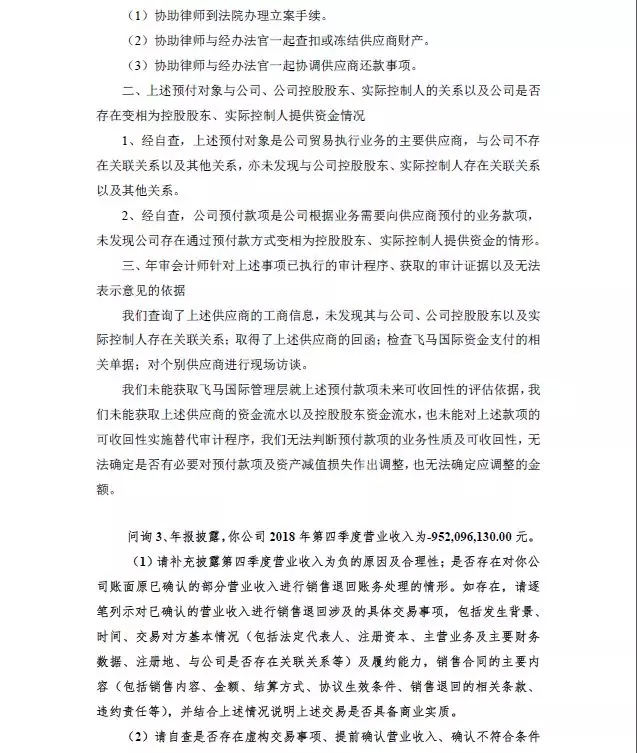 飞马国际2018年财务报告被立信会计师事务所出具了无法表示意见的审计报告,会计师质疑逾期应收款项的真实性;深圳证监局问询125亿元预付账款、应收账款和其他应收款账面的真实性,被证监局、交易所质疑存在关联方资金占用;2018年第四季度营业收入为-9.52亿元,被质疑虚构交易、财务造假,交易所问询:“请自查是否存在虚构交易事项、提前确认营业收入、确认不符合条件的收入、收入确认与回款情况相背离的情形”。